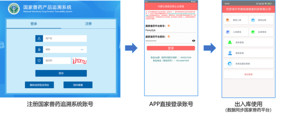 国家兽药产品追溯平台审核通过后,用户通过"兽药溯源APP直接登录国家兽药平台账号"完成信息补全即可获得企业用户所有功能权限,包括兽药出入库管理、出入库查询及库存查询等功能。